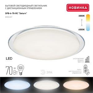 Описание: Потолочный светильник SPB-6 мощностью 70 Вт из космической коллекции Saturn. Но лаконичный дизайн не последнее преимущество этой модели. В комплекте с потолочным светильником идет пульт управления, с помощью которого происходит регулировка времени отключения (через 30 мин или 1 ч), яркости и цветовой температуры. Круглый потолочный светильник работает на светодиодах, которые не перегорают и экономят до 80. Еще одним приятным достоинством люстры является ночной режим, который светит на минимальной яркости и заботится о комфорте глаз после темноты. Пусть Вас не смущает простой дизайн потолочного светильника - он отлично дополнит минималистичный и аккуратный интерьер в комнате. Приобретайте светодиодный светильник SPB-6 Saturn от бренда ЭРА!