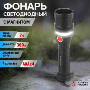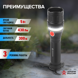 Описание: ЭРА Армия России "Буря" МВ-902 - светодиодный фонарь-светильник с удобной складной подставкой и магнитом. Корпус из прочного анодированного алюминия - на таком не остаются царапины и сколы. Фонарь-трансформер можно использовать для дальнего направленного света (300 метров!) или в качестве настольного светильника, слегка сдвинув верхнюю часть. Работает от 4 пальчиковых батареек, одно комплекта хватает в среднем на 4-5 часов непрерывного свечения. Высокий световой поток - 430 Лм. Кнопка покрыта приятным на ощупь прорезиненным материалом. Фонарь входит в специальную серию ЭРА Армия России, созданную совместно с компанией "Военторг" по лицензии Министерства обороны РФ.
