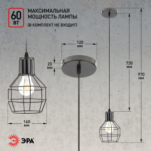 Описание: Черный подвесной светильник PL11 BK компании Эра отличается выразительным дизайном, благодаря чему органично дополнит интерьер в стиле лофт или хай-тек. Он выполнен в форме решетки с угловатыми сторонами. Длинный провод позволяет размещать лампу на высоких потолках; в помещениях со стандартными потолками подобная лампа будет создавать пространство с ярким светом. Модель имеет цоколь Е27, подходит для лампы накаливания 60 Вт внутри помещений. Черный подвесной светильник впишется в интерьер кафе, кухни, столовой, балкона или магазина. Данная модель наилучшим образом сочетается с филаментной лампой.