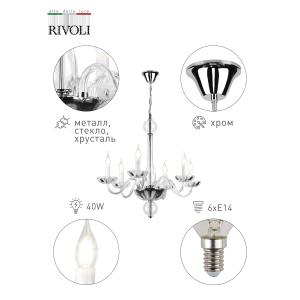 Описание: Rivoli Aria - коллекция итальянского бренда Rivoli. "Aria" - в переводе с итальянского "воздух". Аккуратный лаконичный дизайн этих люстр на потолок, изготовленных из металла и стекла, делает их почти невесомыми и способными раствориться в любом интерьере. Плавные линии, неяркие базовые цвета, минимум деталей. Красивые в своей простоте, люстры и бра Rivoli Aria станут универсальным решением для тех, кто хочет придерживаться классического стиля, но в то же время любит необычные решения. Коллекцию представляют 6-рожковые люстры потолочные (арт. 1001-206), люстры в гостиную под 8 ламп (1001-208) и настенное бра под 1 лампу (арт. 1001-402). Данная люстра с 6 рожками-канделябрами применяется с 6 лампами Е14 мощностью 40 Вт и входит в категорию "подвесные люстры". Высоту этой красивой люстры можно подстроить под ваш потолок. Освещаемая площадь люстры Aria - 18 м². Идеально сочетается с обычными или светодиодными лампами в виде свечей. Торопитесь купить по выгодной цене!