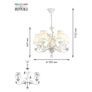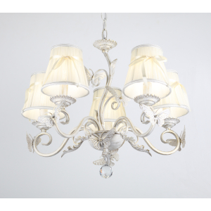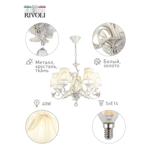 Описание: Люстра потолочная Rivoli Farfalla – это стильный и современный подвесной светильник, который отлично дополнит ваш интерьер. Он состоит из абажуров, обтянутых декоративной кремовой тканью с бантиками. "Farfalla" в переводе с итальянского - "бабочка". Витиеватый бело-золотой каркас облюбовали светлые бабочки с ажурными крыльями. Арматура выполнена в стиле шебби шик. Оригинальный подвес в виде цепочки позволяет настроить люстру на нужную высоту, чтобы обеспечить комфортное освещение для всех уголков комнаты. Потолочный светильник освещает площадь 15м2. В качестве источника света подойдут лампы с цоколем E14 максимальной мощностью 40Вт. Обратите внимание, что лампочки в комплектацию не входят, для данного светильника необходимо приобрести 5 ламп.