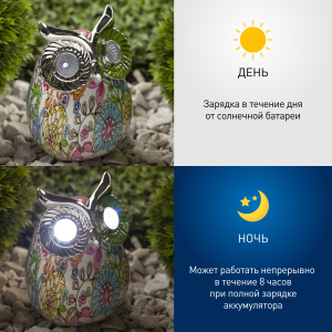 Описание: Садовый светильник на солнечной батарее ERAFYS01-03 "Сова" станет необычным персонажем на Вашей дачной территории. Небольшие внешние габариты позволят Вам разместить светодиодную подсветку в саду, украсить пруд, изящно подсветить кустарники или вход в террасу. Фигурка из искусственного камня высотой 15 см с легкостью устанавливается в землю. Светильник функционирует на солнечной батарее. Такой тип получения энергии является максимально экологичным, энергоемким, а также бесшумным. Питание происходит во включенном режиме, днем. После захода солнца пузатая сова "просыпается". Ее огромные глаза сияют белым заливным светом, создавая атмосферу сказки, волшебства. Забавный дизайн в цветочек на корпусе посеет радость и веселье среди жильцов участка, органично впишется в растительность. Сова сможет радовать Вас непрерывно в течение 8 часов. Высокая степень защиты от пыли и влаги позволяет оставлять светильник на улице даже во время дождя. Обращаем Ваше внимание, что перед использованием фигурки её необходимо включить и зарядить. Светильник заряжается в течение всего светового дня. Декоративный светильник ERAFYS01-03 "Сова" от бренда ЭРА маленький мудрый обитатель Вашего сада!