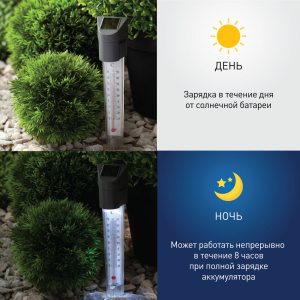 Описание: Уличный светильник градусник ERATR024-02 станет практичным дополнением на Вашем загородном участке или дома. Садовый термометр замеряет температуру воздуха. Можно устанавливать на газоне, в цветочный горшок. Устройство из пластика высотой 33 см с легко втыкается в землю с помощью заостренной ножки в комплекте. Садовый светильник работает на солнечной батарее. Данный вид получения энергии является максимально экологичным, энергоемким, а также бесшумным. Питание происходит во включенном режиме, в дневное время. В темное время суток загорается встроенная в корпус лампочка. Высокая степень защиты от пыли и влаги позволяет оставлять светильник на улице даже во время дождя. Декоративный садово-парковый светильник от бренда ЭРА компактный вариант для замера температуры воздуха на Вашем участке.
