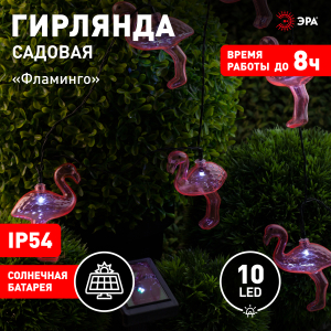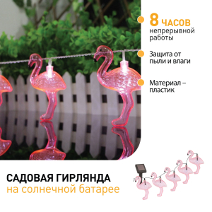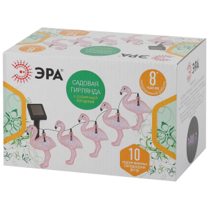 Описание: Уличная гирлянда ERADG012-07 "Фламинго" станет необычным украшением вашей дачной территории. Удобная конструкция и простая сборка позволят Вам расположить подсветку для сада среди растений, необычно подсветить аллею, вход в дом, фасад здания или окно. Гирлянда состоит из 10 пластиковых фигурок высотой 10 см. Гирлянда садовая уличная функционирует на солнечной батарее. Данный способ получения энергии является наиболее экологичным и энергоемким. Питание происходит во включенном режиме. С наступлением темноты фламинго загораются. Фигурки заливаются спокойным розовым светом и освещают территорию или объект вокруг себя, создавая романтическую атмосферу. Подсветка улицы может длиться непрерывно в течение 8 часов. 2 режима позволят настроить освещение в соответствии с индивидуальными предпочтениями. Высокая степень пыле и влагозащиты позволяет оставлять светильник на улице даже во время дождя. Обращаем Ваше внимание, что перед использованием фигурки её необходимо включить и зарядить. Светильник заряжается в течение всего светового дня. LED гирлянда на солнечной батарее от бренда ЭРА чудесный вариант для украшения Вашей территории!