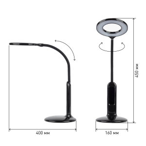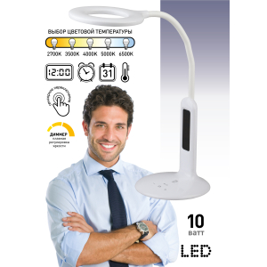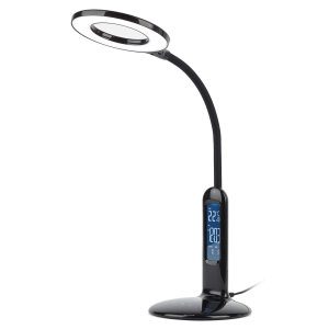 Настольный светильник со светодиодами (LED) в качестве источников света. 5 режимов цветовой температуры света: 2700К - мягкий теплый свет, 3500К - теплый свет, 4000К - белый свет, 5000К - дневной свет, 6500К - холодный свет. Сенсорный переключатель на основании. Плавный или ступенчатый (на выбор) диммер для регулировки яркости. ЖК дисплей с функциями часов, будильника, календаря и термометра. Выбор яркости дисплея с возможностью его выключения. Сохранение выбранных настроек света при включении-выключении. Гибкая стойка. |