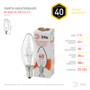 Описание: Лампа накаливания вольфрамовая для бытового и аналогичного общего освещения. Лампа с колбой в виде свечи используется для декоративного оформления светильника, придания ему законченного и совершенного вида. Она красиво смотрится, создавая эффект настоящей зажженной свечи, что привносит в интерьер комнаты более уютный, успокаивающий и "теплый" вид. Прозрачная колба лампы создана специально для эффектов абсолютно чистого, искрящегося света.
