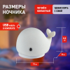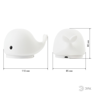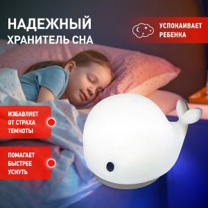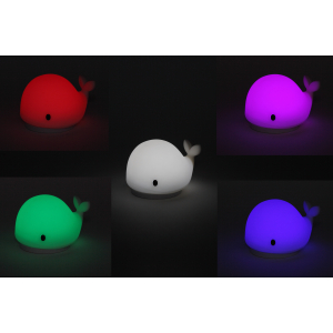 Светильник-ночник со светодиодами (LED) в качестве источников света. "Мягкий" материал. Работает от элементов 3 х ААА (не входят в комплект поставки) или от USB. USB кабель в комплекте. Выключатель для выбора типа питания и отключения/блокировки сенсора. 2 режима (переключение прикосновением): белый свет, RGB c переходами цветов. Дизайн в виде кита. |