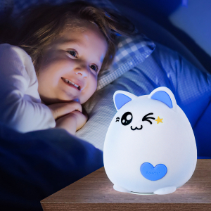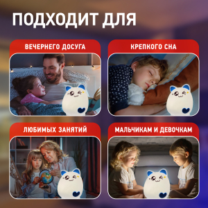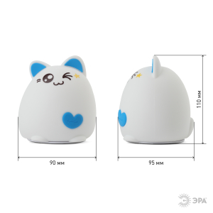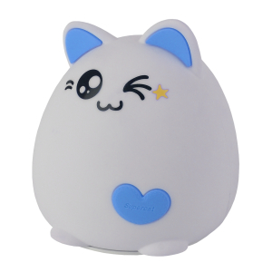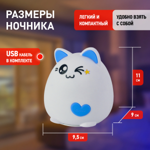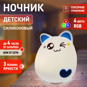 Светильник-ночник со светодиодами (LED) в качестве источников света. "Мягкий" материал. Работает от элементов 3 х ААА (не входят в комплект поставки). Выключатель для отключения/блокировки сенсора. 3 режима (переключение прикосновением): белый свет половина яркости, белый свет максимальная яркость, RGB c переходами цветов. Дизайн в виде котенка. |
