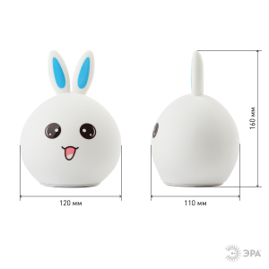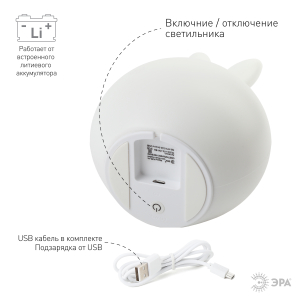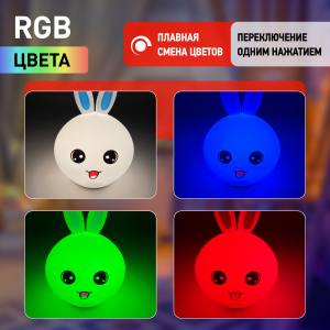 Светильник-ночник со светодиодами (LED) в качестве источников света. "Мягкий" материал. Работает от встроенного литиевого аккумулятора. Подзарядка от USB. USB кабель в комплекте. Выключатель для отключения/блокировки сенсора. 3 режима (переключение прикосновением): белый свет половина яркости, белый свет максимальная яркость, RGB c переходами цветов. Дизайн в виде зайца. |
