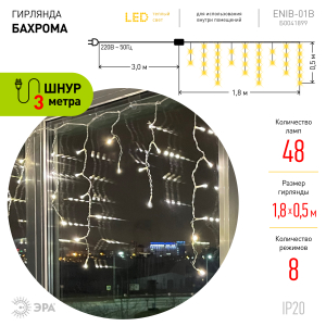Описание: Новогодняя гирлянда ЭРА "Бахрома" с уютным теплым светом создаёт в доме неповторимую атмосферу праздника и волшебства. Благодаря прозрачному проводу складывается впечатление, что яркие огоньки висят в воздухе. Гирлянда состоит из 48 экономичных светодиодов последнего поколения - они не тускнеют со временем и тратят минимум электроэнергии. Работает гирлянда от стандартной электросети 220 В. Длина световой части - 1,8 м. Расстояние от начала иллюминации до вилки - 3 метра, что позволяет использовать эту практичную гирлянду на значительном расстоянии от сети. Светодиоды оригинально расположены на проводах разной длины, так формируется необычная многоуровневая подсветка. Дизайн гирлянды и её тёплый белый свет делают этот товар универсальным для любого времени года и любого торжества. А наличие 8 режимов позволяет выбирать именно то свечение, которое в данный момент подходит под настроение. Создавайте праздник вместе с ЭРА!
