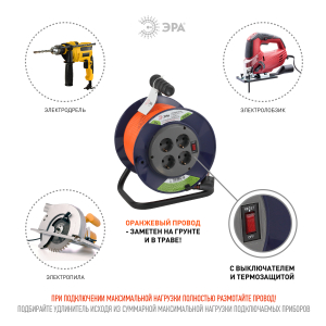 Описание: Удлинитель силовой на пластиковой катушке ЭРА RPx-4es-3x1.5-30m с заземлением, с выключателем, ПВС, 3х1.5м2, 4 розетки, 30м. Мощность 16А/3500Вт. Используется для работы на строительных площадках или дачных участках. Удобен при работе с приборами находящимися удаленно от стационарной розетки. Например газонокосилки, электрические пилы, триммеры или электродрели. Провод в удлинителях Эра сделан из 100% меди, что делает его абсолютно пожаробезопасным. Рама удлинителя сделана из высокопрочной стали, а пластиковой корпус выполнен с применением негорючих добавок. Провод ГОСТ.