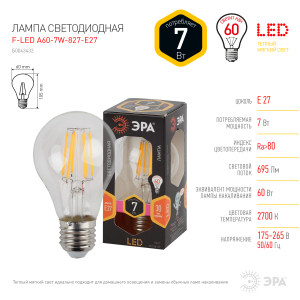 Описание: Светодиодная филаментная лампочка ЭРА F-LED A60-7W-827-E27 для дизайнерских интерьеров и помещений в стиле лофт. Эффектно выглядит как в выключенном виде, так и при включённом освещении за счёт нитевидных светодиодов. F-LED источники света напоминают ретролампы, создают в комнате уникальную атмосферу. Данная лампа среднего размера (105 х 60 мм) имеет самый популярный цоколь Е27. Подойдёт к большинству бытовых светильников, люстр, бра, спотов. Светит тёплым светом, потребляемая мощность 7Вт. Доступное решение для преображения пространства!