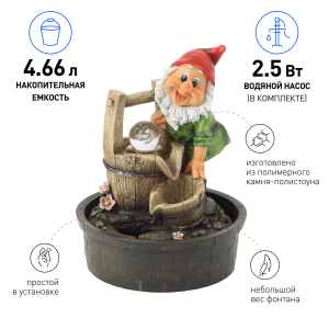 Описание: Если в собственном доме или квартире вы желаете обустроить уютный уголок, где так приятно отдохнуть после тяжелых трудовых часов, обратите внимание на настольный фонтан. Созерцание потока воды с нежным журчанием производит ощутимый релаксационный эффект, успокаивая и расслабляя. Фонтан имеет замкнутую систему - подливайте воду по мере испарения. Тщательно проработаны детали - фигурку хочется рассматривать. Этот декоративный садовый гном Хозяин сделает пейзаж сада интереснее. Разместите его у клумбы, около входа в дом или в беседке.