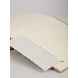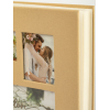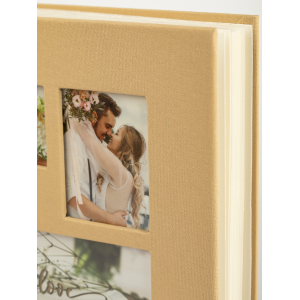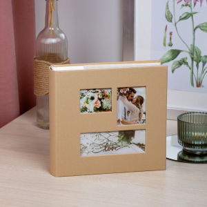 Обложка из плотного картона покрытая тканью с окошками. Внутри содержится блок из 50 белых листов. Альбом рассчитан на 200 фотографий форматом 15 см х 10 см. Для фотографий предусмотрено поле для записей. На каждой странице с фиксатором-окошком из полипропилена можно разместить по 2 фотографии. Переплет книжный.