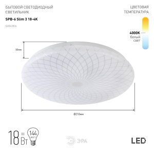 Изящный потолочный светильник SPB-6 "Slim 3" 18-4K от бренда ЭРА прекрасно дополнит любое дизайнерское решение! Наружный диаметр составляет 21 см. Стальной корпус светодиодной люстры обладает противоударными свойствами и отделан глянцем.