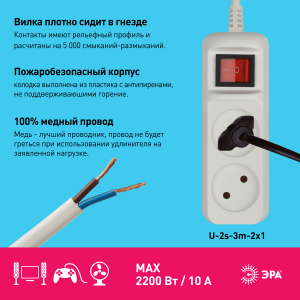 Описание: Удлинитель электрический Эра U-2s-3m-2x1 без заземления, с выключателем, ПВС, 2x1мм2, 2 розетки, 3м. Рассчитан на максимальную мощность 10А/2200 Вт. Удлинитель Эра станет Вашим надежным помощником, если Ваши любимые электроприборы находятся далеко от розеток. Провод в удлинителях Эра сделан из 100% меди, что делает его абсолютно пожаробезопасным. Корпус выполнен из ударопрочного и негорючего пластика (полипропилен). Модель удлинителя на 10А позволяет подключить бытовые приборы общей нагрузкой до 2200Вт. Дизайн удлинителя разработан в России командой Эра Style.