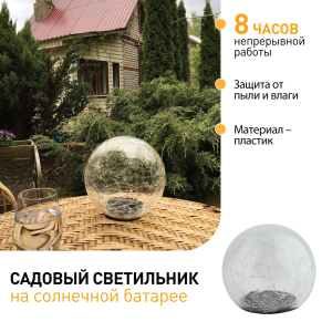 Описание: Декоративный уличный светильник в виде светящегося прозрачного шара с эффектом кракле. ERASF08-25 создаст на Вашем участке атмосферу сказки и поселит волшебство. Небольшие размеры позволят Вам установить светильник в укромном месте сада, украсить декоративный прудик или бассейн, необычно подсветить цветы, аллею или альпийскую горку. Фигурка из пластика диаметром 20 см с легкостью устанавливается в землю. Стеклянный шар с эффектом кракле. Отлично смотрится в саду днем как декоративный элемент и восхищает ночью своим светом. Максимальный эффект достигается в сочетании с шаром малым (15 см).Светодиодный светильник функционирует на солнечной батарее. Данный вид получения энергии является самым экологичным, энергоемким, а также бесшумным. Питание происходит во включенном режиме "ON", днем. С наступлением темноты шар загорается теплым белым светом. Создается ощущение, что он обладает магическими свойствами, а внутри мелькает множество светлячков. Солнечная батарея рассчитана на 8 часов непрерывной работы. Высокая степень пыле и влагозащиты, а также ударопрочность корпуса позволяют оставлять светильник в саду во время дождя. Обращаем Ваше внимание, что перед использованием фигурки её необходимо включить и зарядить. Светильник заряжается в течение всего светового дня. Садово-парковый светильник шар от бренда ЭРА волшебство ближе, чем Вы думаете!