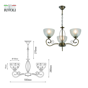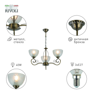 Описание: Утончённая классика и безусловная красота. Плафоны этих люстр раскрыты наверх, к потолку, и напоминают чашки дорогого чайного сервиза. Каждая "чашка" изготовлена из стильного матового стекла и украшена оригинальным цветочным орнаментом, а металлический каркас - словно одно из произведений искусства, выставляемых в лучших музеях Рима. Тонкие, невесомые, полные молодости и жизни - люстры Rivoli Loren будто переместились во времени и пространстве прямиком из старых фильмов с Софи Лорен. Коллекция представлена 3-х рожковой люстрой.