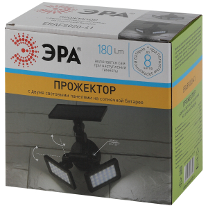 Влагозащищённый фасадный прожектор ЭРА ERAFS020-41 с двумя световыми панелями и выносной солнечной панелью, которая может монтироваться отдельно от источника света. Не требует привязки к электросети и может быть установлен в любом нужном пользователю месте. Встроенный датчик движения.