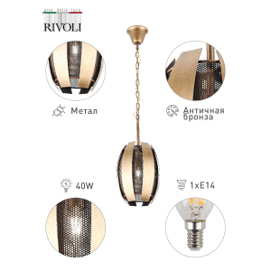 Описание: “Diverto" - в переводе с итальянского “веселье". Эта серия, действительно, похожа на шутку, она только с виду кажется серьезной. Но присмотритесь - теплый цвет античной бронзы, округлые формы и мягкий свет, струящийся сквозь металлическую сетку как маленькие искорки или веснушки озорного ребёнка. В коллекции представлен подвесной светильник на 1 лампу.
