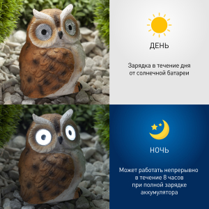 Описание: Садовая фигурка ERAFYS01-11 "Рыжий филин" мило украсит Вашу дачную территорию. Небольшие размеры позволят Вам расположить светильник в саду, украсить прудик, альпийскую горку, необычно подсветить цветы, деревья или вход в дом. Фигурка из полистоуна высотой 13 см с легкостью устанавливается в землю. Беспроводной led светильник функционирует на солнечной батарее. Такой вид получения энергии является наиболее экологичным, энергоемким, а также бесшумным. Питание происходит во включенном режиме, в дневное время. С наступлением ночи рыжий филин оживает. Территория вокруг фигурки начинает светиться белым светом, исходящим из больших любопытных глаз. Точечная проработка деталей филина и его забавная поза создают впечатление настоящей птицы. Солнечная батарея рассчитана 8 часов непрерывной работы. Высокая степень пыле и влагозащиты позволяет оставлять садовый светильник на улице даже в непогоду. Обращаем Ваше внимание, что перед использованием фигурки её необходимо включить и зарядить. Светильник заряжается в течение всего светового дня. Декоративный садовый светильник от бренда ЭРА прекрасный вариант для преображения Вашего участка.