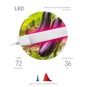 Светильник для выращивания растений. Профессиональный спектр для периода вегетации. Мощность: 36 Вт., Напряжение питания: 220-240V; 50-60 Гц.; PF 0.9, Пульсации <5%;IP65, Ra 80 |