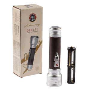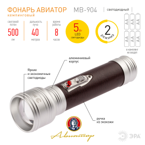 Описание: ЭРА "Авиатор" МВ-904 эффектный светодиодный фонарь в стилистике прошлого столетия. Отличается повышенным световым потоком 500 Лм. Корпус изготовлен из прочного анодированного алюминия, устойчивого к ударам, царапинам, сколам. Ручка покрыта коричневой экокожей фонарь выглядит стильно, его приятно держать в руках. Работает от 6 пальчиковых батареек. Одного комплекта элементов питания хватает на 8 часов непрерывного свечения. Новый фонарь от ЭРА выпускается в красивой дизайнерской упаковке, что делает его отличным подарком к любому празднику.