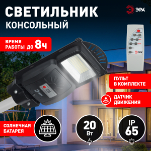 Описание: Консольные уличные LED-светильники ЭРА на солнечных батареях эффективно работают круглый год. Солнечная батарея встроена в корпус и занимает всю внешнюю часть плафона. На внутренней части размещены светодиодные платы (одна или несколько - в звисимости от модели) с яркими и экономичными LED-элементами COB последнего поколения и широкими светоотражателями. Имеют авторежим, позволяющий с успехом экономить заряд. В течение первого часа после включения светят со 100% яркостью, следующие 3 часа - с 70% яркостью и далее до рассвета - с 30% яркостью. Так мы получаем максимально яркий свет в нужное время (вечером, сразу после захода солнца) и гарантию того, что дополнительного освещения хватит до самого утра. Ещё одно важное преимущество для экономии заряда - в светильники встроен датчик движения. Освещение будет включено только в тот период, когда рядом со светильником находятся люди. Это значит, что светильники не будут работать ночью "зря". Обе эти функции - и авторежим, и датчик движения - можно отключать, если для вас они неактуальны. И снова включать, если данные опции понадобились. В комплекте поставляется пульт дистанционного управления, который позволяет на расстоянии включать и выключать свет, отключать датчик движения, устанавливать таймер работы, регулировать яркость. Надёжно защищены от влаги и пыли (IP65) и отлично работают в широком температурном диапазоне (от -20°C до +60°C). Оснащены морозоустойчивым сменным аккумулятором Li-FePO4.