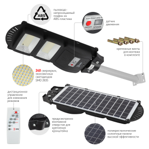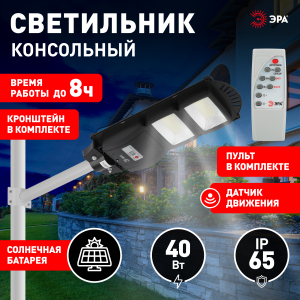 Описание: Консольные уличные LED-светильники ЭРА на солнечных батареях эффективно работают круглый год. Солнечная батарея встроена в корпус и занимает всю внешнюю часть плафона. На внутренней части размещены светодиодные платы (одна или несколько - в звисимости от модели) с яркими и экономичными LED-элементами COB последнего поколения и широкими светоотражателями. Имеют авторежим, позволяющий с успехом экономить заряд. В течение первого часа после включения светят со 100% яркостью, следующие 3 часа - с 70% яркостью и далее до рассвета - с 30% яркостью. Так мы получаем максимально яркий свет в нужное время (вечером, сразу после захода солнца) и гарантию того, что дополнительного освещения хватит до самого утра. Ещё одно важное преимущество для экономии заряда - в светильники встроен датчик движения. Освещение будет включено только в тот период, когда рядом со светильником находятся люди. Это значит, что светильники не будут работать ночью "зря". Обе эти функции - и авторежим, и датчик движения - можно отключать, если для вас они неактуальны. И снова включать, если данные опции понадобились. В комплекте поставляется пульт дистанционного управления, который позволяет на расстоянии включать и выключать свет, отключать датчик движения, устанавливать таймер работы, регулировать яркость. Надёжно защищены от влаги и пыли (IP65) и отлично работают в широком температурном диапазоне (от -20°C до +60°C). Оснащены морозоустойчивым сменным аккумулятором Li-FePO4.