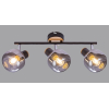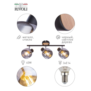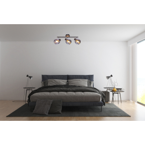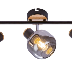 Описание: Броский дизайн этих светильников достигается сочетанием контрастных оттенков затемнённых выдувных плафонов и тёмного металлического каркаса с декоративными элементами из светлого дерева. Споты оснащены долговечными поворотными механизмами высокого качества с надёжной фиксацией. Коллекция представлена настенно-потолочным светильником на 3 лампы.