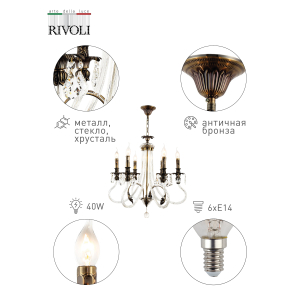 Описание: Rivoli Люстра потолочная / Светильник потолочный светодиодный для кухни, гостиной, в детскую, спальню Утончённость и кинематографичность этой серии неслучайна: она названа в честь Марлен Дитрих блистательной голливудской актрисы и настоящего секс-символа 1930-х. Если чёрно-белое кино, то только такое: тёмная благородная бронза, чистейшие кристаллы и безоговорочный стиль вне времени. Коллекция представлена 6-ти рожковой подвесной люстрой.