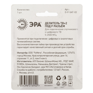 Описание: Телевизионный делитель используется в частных и много квартирах домах для подключения нескольких телевизионных аппаратов к одной антенне. Для установки не требуются специальный инструмент и профессиональные навыки. ТВ делители ЭРА отличает от других производителе высокое качество применяемых материалов, сборки и защита от электромагнитных помех.