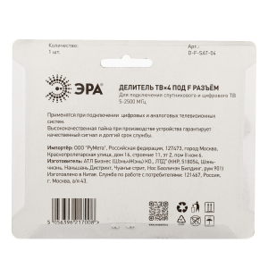 Описание: Телевизионный делитель используется в частных и много квартирах домах для подключения нескольких телевизионных аппаратов к одной антенне. Для установки не требуются специальный инструмент и профессиональные навыки. ТВ делители ЭРА отличает от других производителе высокое качество применяемых материалов, сборки и защита от электромагнитных помех.