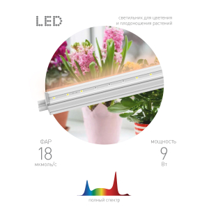 Описание: Светодиодный фитосветильник ЭРА FITO-9W-Т5-Ra90 мощностью 9 Вт - отличный вариант для растений на всем протяжении их развития. Правильное сочетание длин волн и энергии в спектре данной лампы - отличный рецепт для подкормки Ваших растений. Светильник не слепит ярко фиолетовыми оттенками, его свечение приятно для глаз. В то же время спектр оптимален для роста и развития растений вне зависимости от сорта и культуры. Растения выращенные под данным светильником имеют выраженный, специфичный для них аромат и вкус. Находясь под данной фитолампой, Ваши зеленые друзья научатся с легкостью переживать пересадку и пикировку. Площадь эффективного излучения составляет 1 м2. Для владельцев крупных хозяйств есть огромный плюс: до 14 светодиодных светильников легко соединяются в одну линию без дополнительных креплений. Корпус выполнен из прочного пластика. Он не нагревается, неприхотлив в уходе. При возникновении горения лампа автоматически затухает. Работа фитосветильника никак не влияет на зрение. Пульсаций менее 0,4% не будет раздражать глаза. Необходимо помнить, что затраченная мощность прямо пропорциональна урожаю. Для корректирования времени досветки необходим таймер для фитоламп ЭРА FITO-LINETIME (1,5 м) - 15515785. Время досветки настраивается от 9 до 15 часов. Рекомендуемое расстояние от светильника от 5 до 35 см. Длина шнура питания - 0,5 м. Вырастить собственный урожай теперь не составит труда! Приобретайте фитолампу компании ЭРА и наслаждайтесь процессом! Фитолампа для растений / светодиодный светильник для рассады / фито лампа / фитосветильник. Редактировать