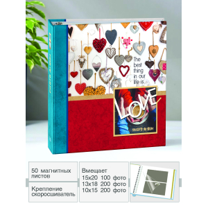 Описание: Фотоальбом с магнитными листами , размер листов 23*28 , крепление - скоросшиватель , обложка -картон , 50 магнитных листов, тематика - любовь ,сердца