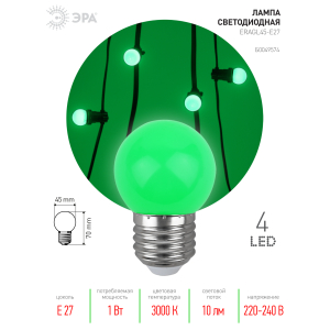 Описание: Декоративная светодиодная лампа ЭРА "Белт-лайт" с цоколем Е27 и колбой шар (Р45) зелёного цвета. Мощность - 1 Вт. Идеально подходит для использования в уличной гирлянде-конструкторе ЭРА "Белт-лайт", дающей возможность самостоятельного дизайна и монтажа праздничной иллюминации. В составе гирлянды-конструктора позволяет создавать уникальное праздничное освещение по индивидуальным параметрам и для конкретных задач. Вы сами выбираете длину подсветки, цвет ламп и расстояние между источниками света! Это идеальное решение для декора фасадов зданий, оформления витрин, общественных пространств на свежем воздухе. Другие элементы гирлянды-конструктора: патрон Б0049176, кабель Б0049175, набор для подключения (шнур питания с вилкой + коннектор) Б0049180, коннектор Б0049179, заглушка Б0049181, заглушка с крюком Б0049182. В ассортименте ЭРА LED-лампы "Белт-лайт" E27 разных цветов, в том числе прозрачные и матовые белые. Колбы изготовлены из лёгкого ударопрочного пластика, такие лампы удобно транспортировать, использовать и хранить. Цоколь - из алюминия. Лампы ЭРА "Белт-лайт" универсальны: подходят к любому светотехническому прибору с патроном для Е27. Создают необычное цветное свечение определённого оттенка. Помогают воплощать в жизнь смелые дизайнерские идеи.