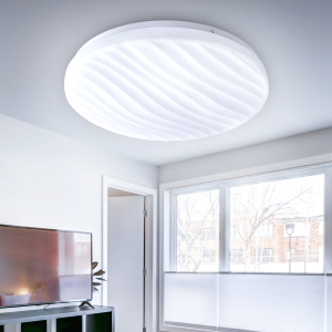 Он устойчив к повреждениям и имеет долгий срок службы. Рельефный дизайн рассеивателя, напоминающий морские волны, идеально сочетается с круглым плоским корпусом. За счет этого электросветильник освежит интерьер гостиной, спальни или прихожей.