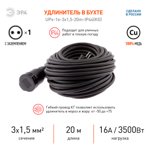 Описание: Удлинитель силовой в бухте ЭРА UPx-1e-3x1,5-20m-IP44(KG) с заземлением, КГ 3x1,5мм2, 1 розетка, 20м, степень защиты IP44. Мощность 16А/3500Вт. Используется для работы на строительных площадках или дачных участках. Удобен при работе с приборами, находящимися удаленно от стационарной розетки. Например, газонокосилки, электрические, пилы, триммеры или электродрели. Провод в удлинителях Эра сделан из 100% меди, что делает его абсолютно пожаробезопасным.