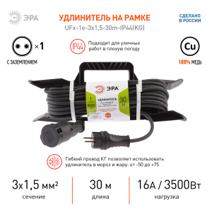 Описание: Силовой удлинитель на рамке ЭРА UFx-1e-3x2,5-30m-IP44(KG). С одной влагозащищенной розеткой и проводом КГ с заземлением длиной 30 метров, сечением 3х2,5 мм2. Класс защиты IP44. Мощность 16А/3500Вт. Надежный, мощный удлинитель для любых работ. Характеристики провода КГ позволяют работать с удлинителем в широком диапазоне температур, что подойдет для любого времени года.