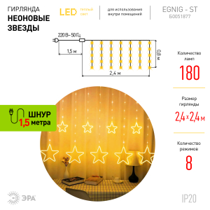 Описание: Светодиодная праздничная гирлянда ЭРА "Неоновые звезды" 2.4х0.8 м ЕGNIG-ST (арт. Б0051877) создаст дома теплую атмосферу к Новому году и Рождеству! Гирлянда-занавес особенно красиво будет смотреться на окнах. Данная модель состоит из 180 светодиодов с теплым белым светом, фигурки выполнены в форме звезд разного размера. Электрогирлянда дождик имеет незаметные полупрозрачные провода, длина кабеля составляет 1.5 метра, класс защиты IP20 (использование внутри помещений), питание 220 В. Гирлянда LED ЭРА прослужит много лет, станет универсальным украшением гостиной, кухни, спальни или другого пространства, а еще это необычный подарок для Ваших близких! Новогодний декор всегда создает ощущение праздника!