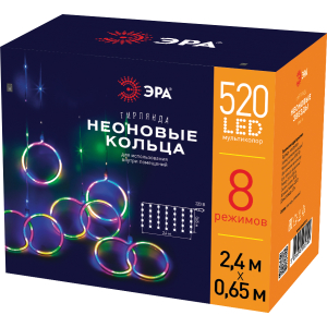 Описание: Новогодняя гирлянда светодиодная ЭРА "Неоновые кольца" 2.4х0.65 м EGNIG-RI (арт. Б0051878) создаст дома неповторимую атмосферу к Новому году и Рождеству! Гирлянда штора особенно красиво будет смотреться на окне. Данная модель состоит из 520 светодиодов с разноцветным светом (мультиколор), фигурки выполнены в форме одинарных и двойных колец. Электрогирлянда дождик имеет незаметные полупрозрачные провода, длина кабеля составляет 1.5 метра, класс защиты IP20 (использование внутри помещений), питание 220 В. Гирлянда LED ЭРА прослужит долгие годы, станет универсальным украшением гостиной, кухни, спальни или другого пространства, а еще это отличный подарок для Ваших любимых! Новогодний декор для дома всегда вдохновляет и дарит настроение праздника!