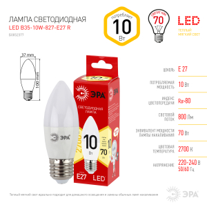 Описание: Бытовая светодиодная лампа ЭРА Серии Бюджет, создаёт яркое ровное освещение и экономит до 90% электроэнергии по сравнению с лампой накаливания с аналогичным световым потоком. Светит теплым светом с жёлтым оттенком - такая цветовая температура эффективна для отдыха и уютной атмосферы в доме. Используется в потолочных, настенных, настольных светильниках, в люстрах и бра. Мгновенно включается и не нагревается.