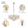 Rivoli Waltraud (арт. 1028-206) - уникальная хрустальная люстра в модном современном исполнении. Крупные декоративные элементы из чистейшего прозрачного хрусталя расположены в индивидуальных прямоугольных ячейках из металла золотого цвета. Абажур люстры (диаметр - 560 мм) формируют канделябры трендовой выверенной формы. Хрусталь подчеркивает красоту излучаемого люстрой света.