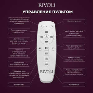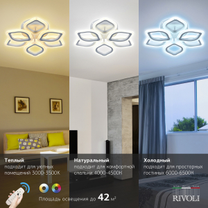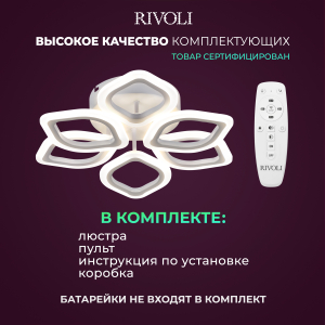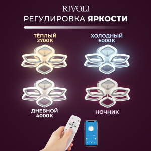 В комплекте с LED люстрой Rivoli Elena поставляется пульт дистанционного управления. А скачав приложение, вы сможете дистанционно управлять люстрой через телефон. Не вставая с дивана, можно включить или выключить люстру, настроить комфортную яркость освещения, выбрать нужную температуру света (уютный теплый, нейтральный дневной или бодрящий холодный свет). Эта светодиодная люстра создана для вашего комфорта.