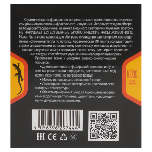 Описание: ИК-нагреватель в виде лампы с цоколем Е27, мощность — 50 Вт. Керамические инфракрасные нагревательные лампы серии ЭРА CeramiHeat используются для акклиматизации новорожденных животных, выращивания молодняка, обогрева брудеров, террариумов. Источник длинноволнового инфракрасного излучения, которое улучшает рост животных. Имеет мощный тепловой эффект, при этом не создает видимое световое излучение, а значит не нарушает естественные биологические часы животных. бладает свойствами, аналогичными солнечному тепловому излучению. Тепловое излучение лампы проникает сквозь кожу, расширяет кровеносные сосуды, способствует улучшению микроциркуляции крови. Прогревает ткани и ускоряет физико-биологические процессы в организме животных.