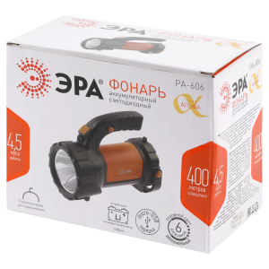 PA-606 светодиодный аккумуляторный фонарь ЭРА серии Альфа. Легкий и очень яркий! Заряжается при помощи поставляемого в комплекте microUSB-кабеля. Емкий литиевый аккумулятор (1400 мАч) держит заряд 4,5 часа при непрерывной работе. Обеспечивает до 400 метров освещения. Основной свет дополняют несколько режимов с разной яркостью и миганием.