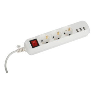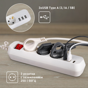 Удлинитель электрический ЭРА U-3es-1,5m-USB с заземлением, с выключателем, 3 розетки, 1,5м ПВС 3x0,75мм2. Рассчитан на максимальную мощность 10А/2200Вт. С 3-мя USB гнездами (Type A) для зарядки портативных устройств. Максимальная мощность USB разъемов: 3100 мА.