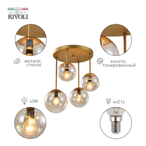 Rivoli Emma (арт. 3117-304) - эффектная люстра на потолок с круглыми тонированными плафонами, расположенными на разных уровнях. Люстры Emma, созданные в стиле модерн, выглядят очень необычно и способны преобразить любой интерьер. Габариты люстры - 320*320*400 мм. Люстра в гостиную Rivoli Emma изготовлена из качественного прочного металла со стойким гальваническим покрытием. Красивый золотой цвет люстры не выцветет со временем, на корпусе не возникнут сколы и царапины. Мягкая тонировка плафонов этой люстры в спальню делает освещение уютным и комфортным для глаз. Рекомендуемые источники света - 4 лампы Е14 мощностью 40 Вт. Люстры Emma совместимы с экономичными светодиодными лампами. Освещаемая площадь такой современной люстры - 12 м². Плафоны люстры изготовлены из стекла.