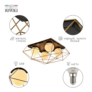 Описание: Rivoli Raila (арт. 4098-304) - дизайнерский светильник потолочный под 4 лампы Е14 40 Вт. Эффектно выглядит за счет сочетания металлического каркасного корпуса и уютных круглых плафонов из белого стекла. Потолочный светильник Raila освещает площадь 12 м². Такой светильник потолочный идеален для кухни или гостиной с невысокими потолками. Стоит купить для комнат с натяжными потолками. Заказать этот светильник потолочный для прихожей или коридора - удачное решение. Размеры - 600*500*270 мм. В коллекции Raila итальянского бренда Rivoli есть также светильники на потолок с 1 лампой (арт. 4098-201) и 2 лампами (арт. 4098-312). Такие светильники - выбор дизайнеров современных интерьеров. Часто их монтируют в комбинациях из нескольких штук. Корпус потолочных светильников Rivoli Raila изготовлен при помощи высокоточной лазерной сварки, арматура имеет стойкое гальваническое окрашивание. Лофт-светильники Raila выполнены в трендовом сочетании золотого и черного цветов.