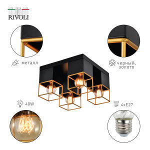 Описание: Rivoli Nadin - коллекция геометричных потолочных светильников от итальянских дизайнеров. Светильники Nadin - идеальное решение на стандартный или невысокий потолок. Выполненные в популярном стиле лофт-кантри, эти светильники потолочные отличаются лаконичностью оформления и качеством материалов. Они изготовлены из легкого прочного металла со стойким гальваническим покрытием. Не выцветут, спустя годы будут выглядеть как новые. Для дизайна этих эффектных потолочных светильников выбрано актуальное сочетание черного матового и золотого цвета. В рамках коллекции Rivoli Nadin можно купить светильник потолочный на нужное вам количество ламп - от 1 до 4. Артикулы для поиска: 7049-701, 7049-702, 7049-703, 7049-704. Применяйте с лампочками Е27 мощностью 40 Вт. Данная модель под 4 лампы освещает площадь 12 м². Удачный вариант потолочного светильника для кухни, прихожей, коридора, спальни, гостиной, загородного дома.